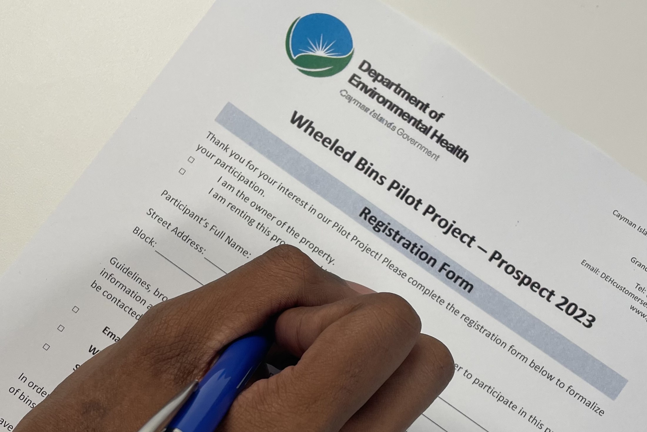 Subject to your completion of a registration form, a wheeled bin will be assigned to the residents. Participants should treat the wheeled bin with due care and attention to prevent it from being damaged or lost. However, the wheeled bin will remain the property of the Cayman Islands Government’s Department of Environmental Health (“DEH”). The wheeled bin can be removed by DEH at any time and for any reason subject to at least 7 days’ notice.